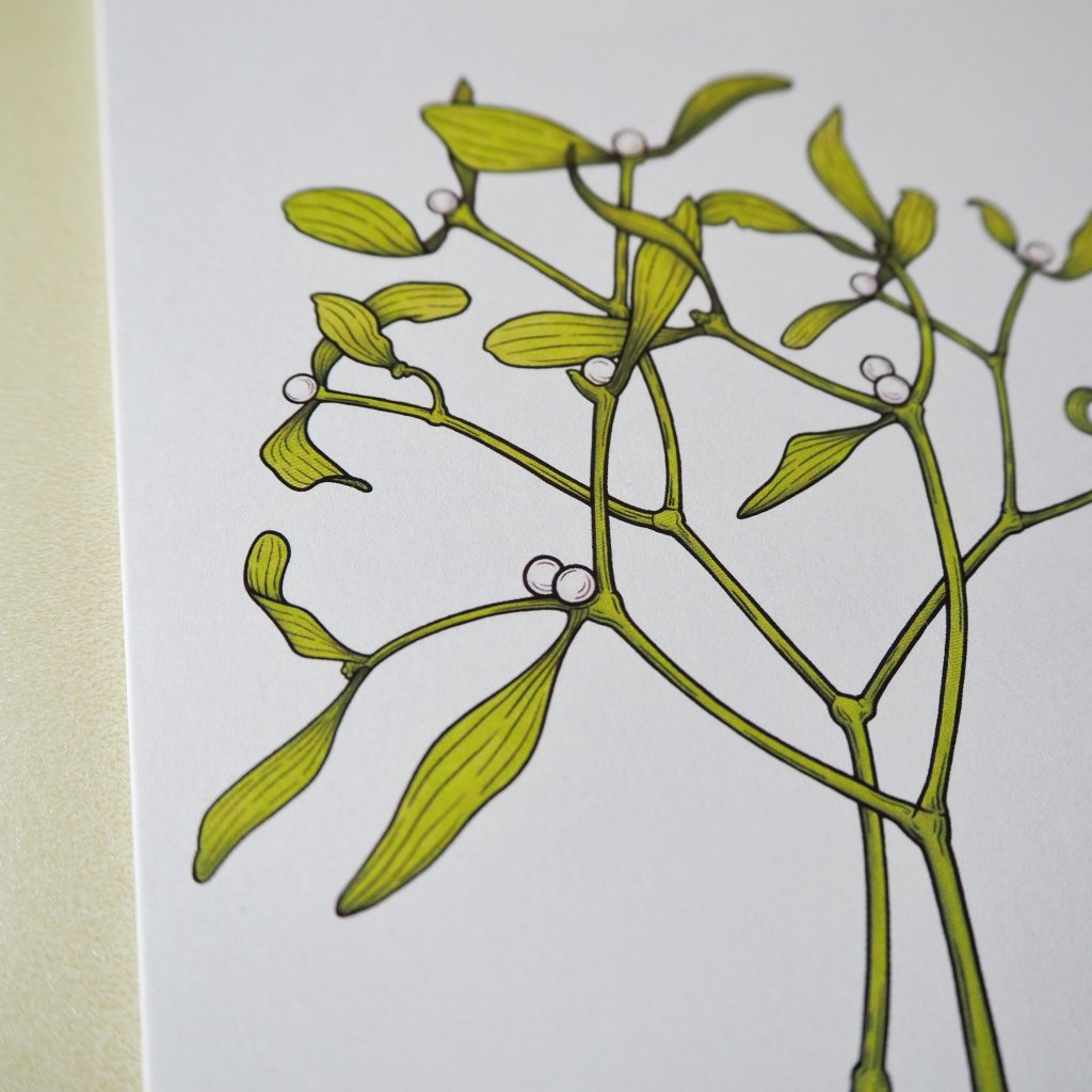 Přáníčko zdobí reprodukce autorské ilustrace jmelí. Motiv je kresbou nakreslenou digitálně s láskou Lucií v našem ateliéru podle větviček jmelí, které jsme si koupili před Vánoci pro potěšení. 💛